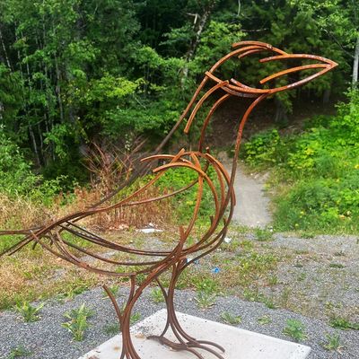 Created by metal artist Steve Rogers, this six-foot tall Raven was inspired by the prevalence of ravens in the region. Ravens and crows are a common site in the Terrace area and this one greets bikers and hikers.