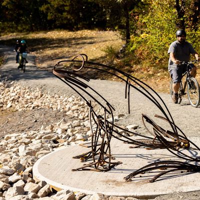 This steel sculpture sits at one of the entrances to the Terrace HUB biking trails on the North side of the Terrace Sportsplex by the pump track.